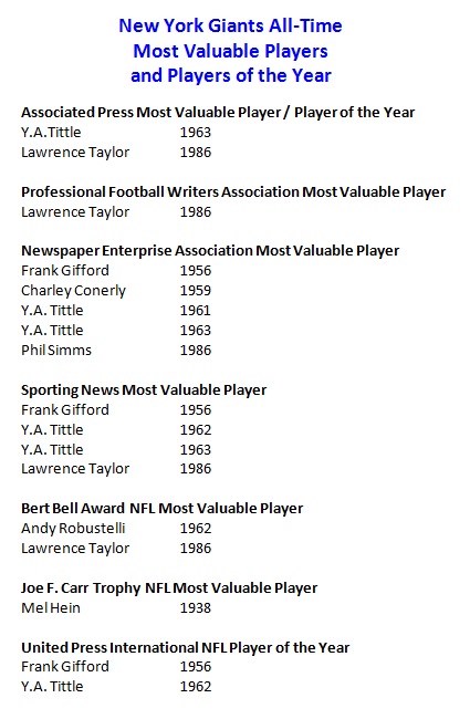 Once the periods were defined, the next challenge was deciding who was worthy. The theme that arose numerous times was weighing a steady performance over a lengthy period of time versus a high level of performance in a relatively brief span. The answer to that question is not an easy one. The example that illustrates this best is the careers of Charlie Conerly and Y.A. Tittle. Hence the decision to include the “honorable mention” designation. Of course, this presented a new challenge. While we strove to keep this project as inclusive as possible, we walked a tight rope of mentioning so many other players that the honor would become diminished.