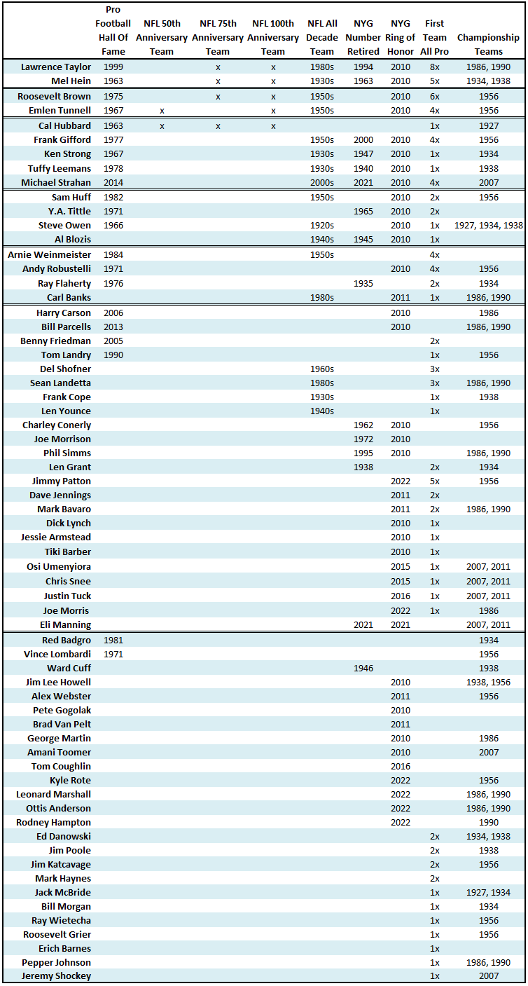 It is important to note that we are currently in pro football’s the fourth era, which will be recognized as the Post-Lockout era. Rules legislation has significantly altered the way the game is being played and continues to evolve before our eyes. We have decided that is premature to create a Post-Lockout team for the Giants at present. What we currently have as the Post-Modern team will remain as is for at least a few more years. While in some instances this will be a positive – for example, having Phil Simms and Eli Manning on their own teams – there simply are not enough players in this era to populate a team and doing so would create more problems that it would solve. As you peruse the list, just know that this is something that is always evolving over time.